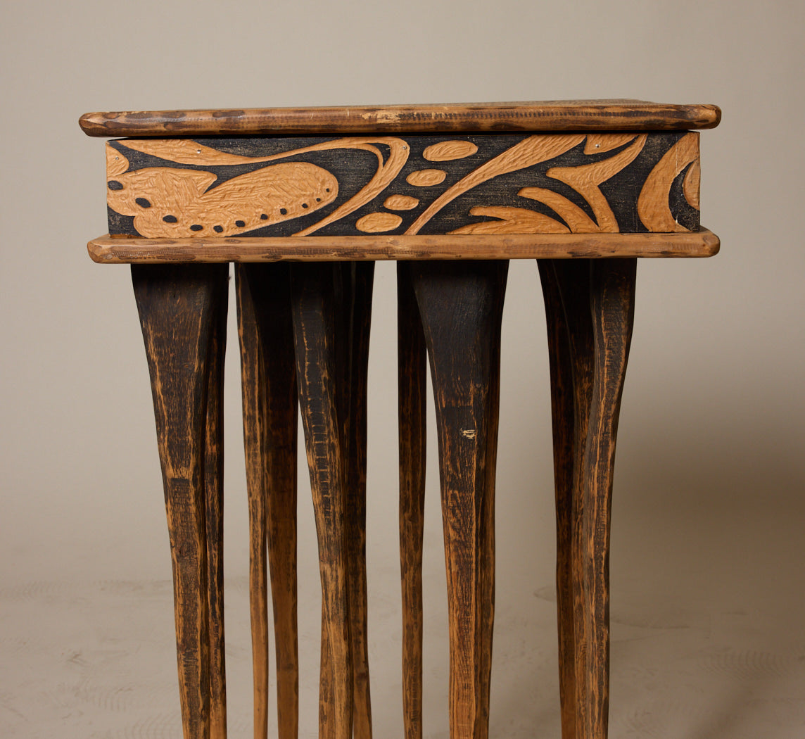 Primitive wooden end table with a sculptural silhouette, carved apron, and tall tapered legs in a dark, textured finish. Lift-top design reveals hidden storage, making it a functional accent piece with strong folk-art character.