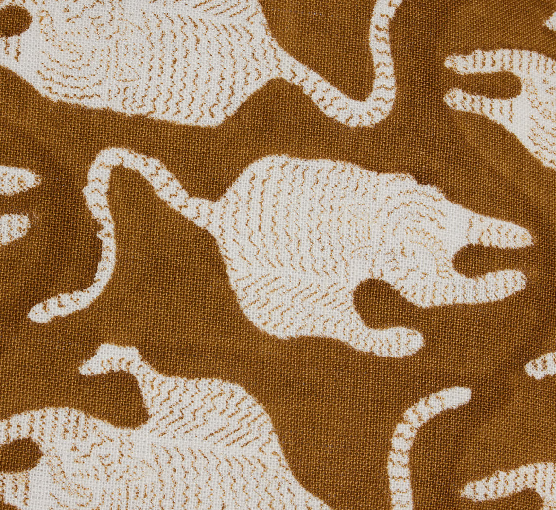 The Silverstein Disc Pillow is crafted in regal tiger block printed fabric. It features rich honey chenille piping and an invisible zipper closure.