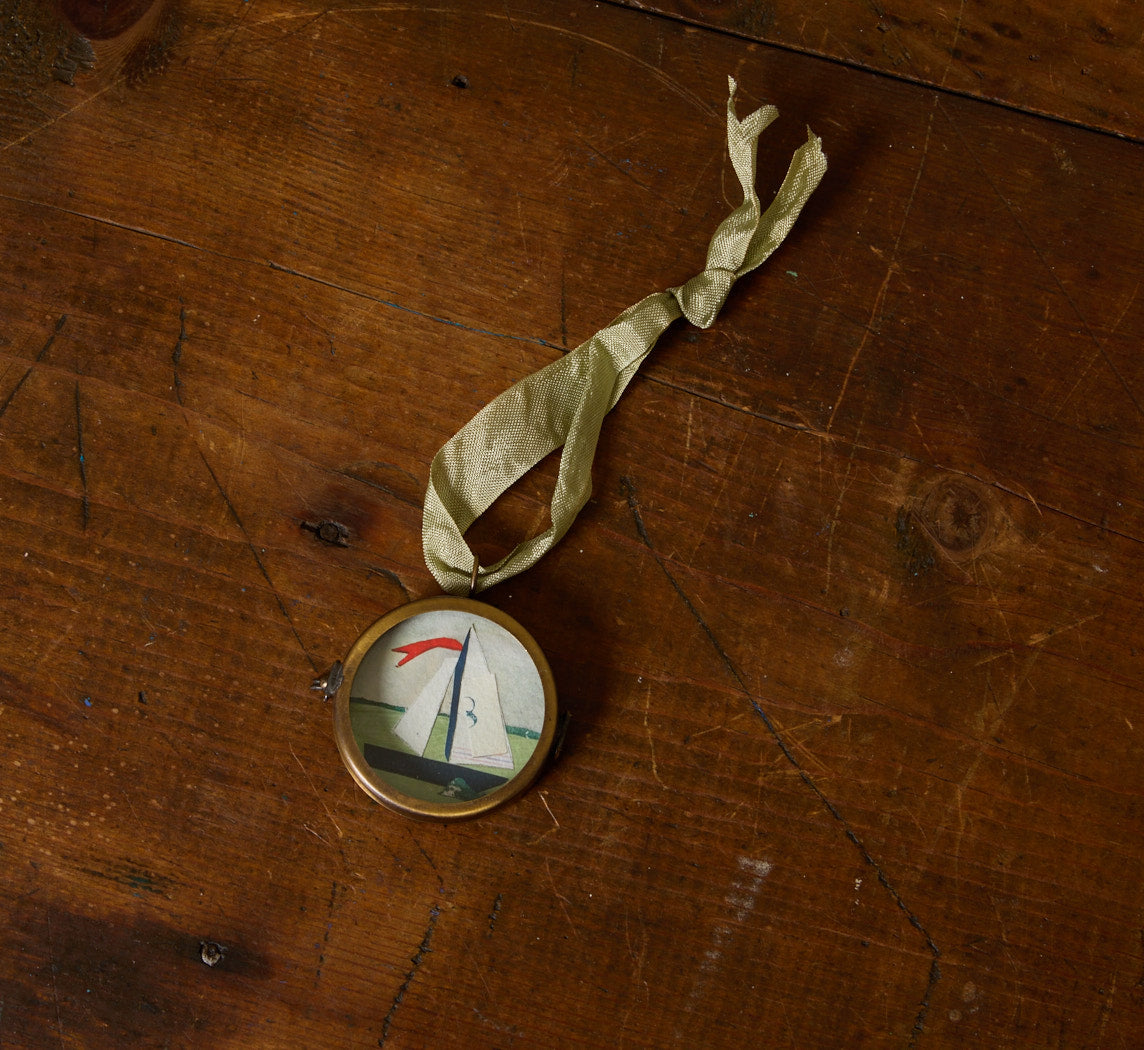 A round sailboat ornament made from a high-quality giclée print on 100% cotton paper, set in a petite antiqued glass locket frame. Adapted from Brandie Stonge’s layered collage work, each piece captures the texture and shadow of the original and is finished with her signature on the reverse.