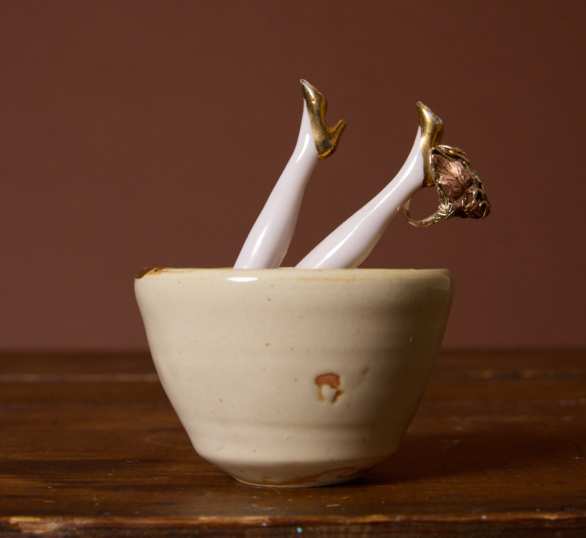 Hand formed ceramic Showgirl catchall dishes by Abra with gold rimmed glazing and a vintage porcelain leg detail set inside each petite form for rings or jewelry. One of a kind and uniquely varied, part of the charm is the surprise!