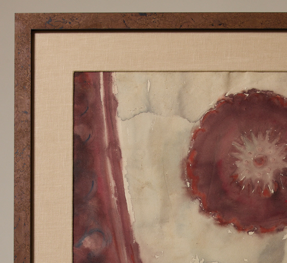 A watercolor still life by Dirk Filarski (1885–1964) of a tabletop clock and glass bowl against a soft, abstracted backdrop in muted reds and blues. Framed with a cream linen mat and cork frame.