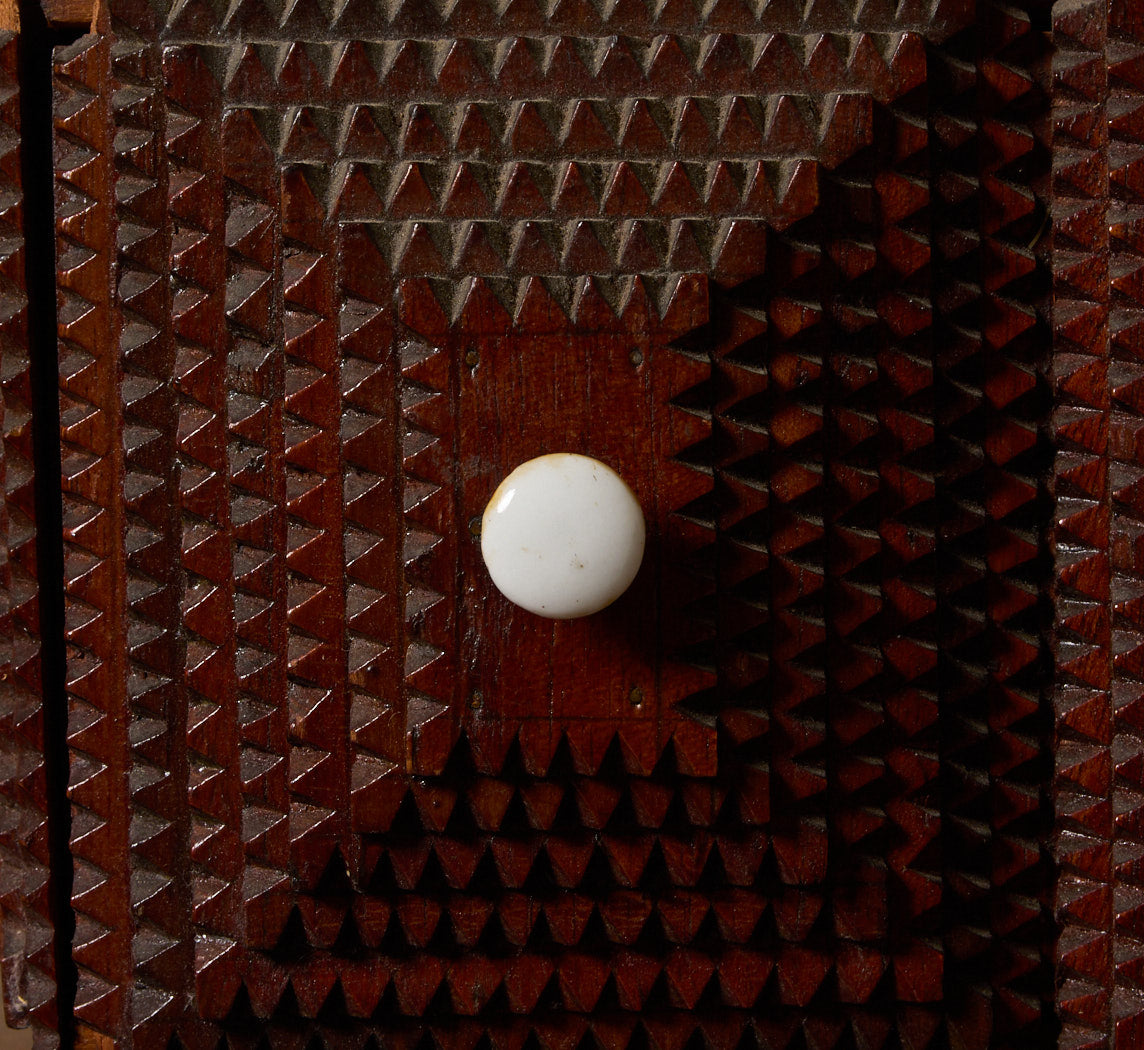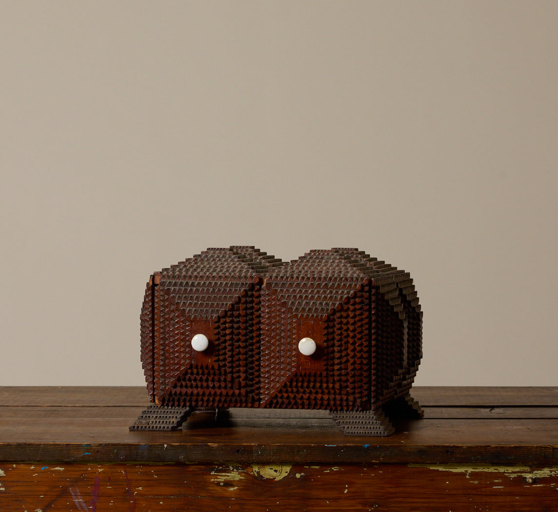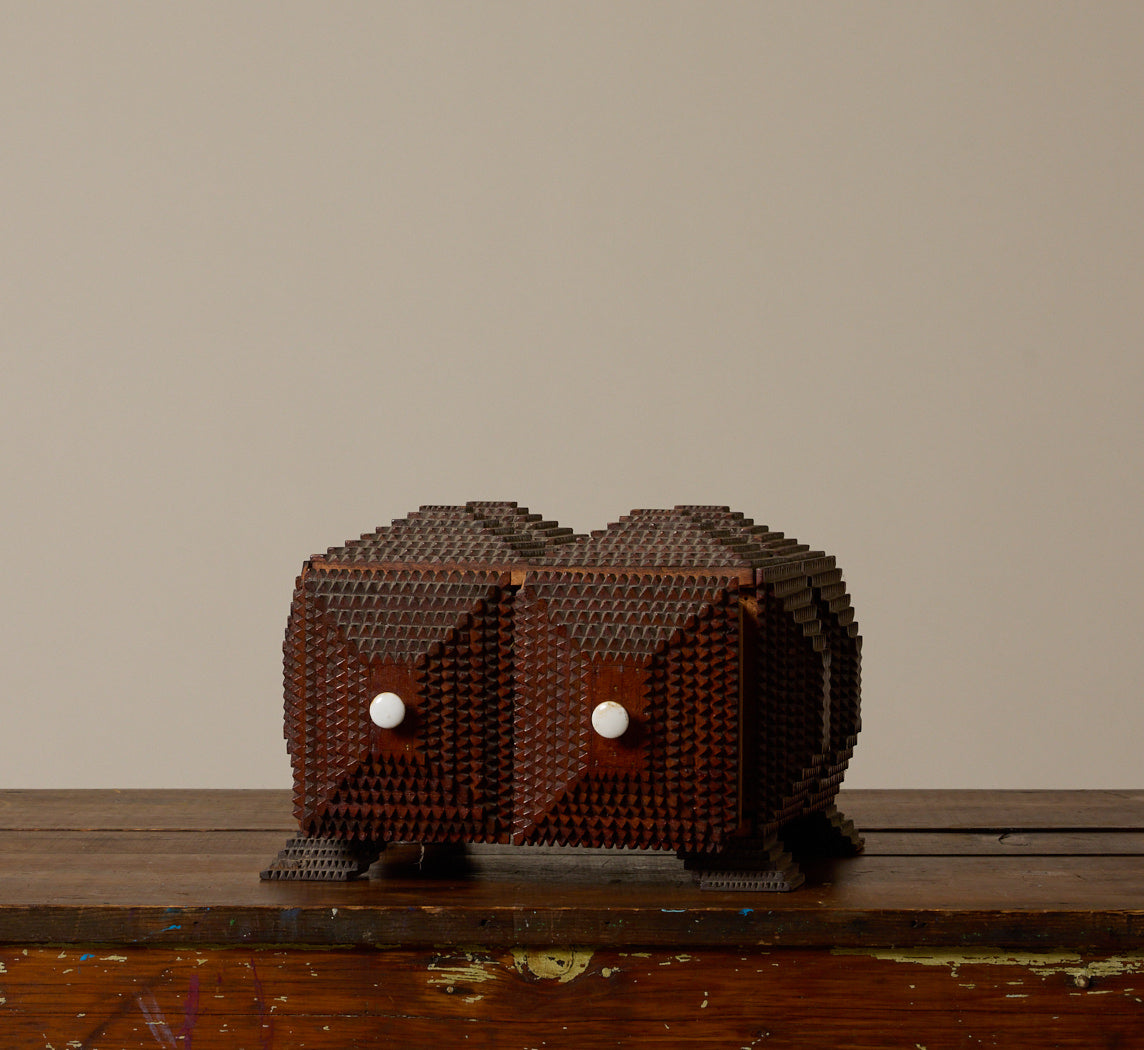 Hand-carved tramp art storage chest with a stacked chip-carved surface and two small drawers. Compact size with white knobs and raised feet.