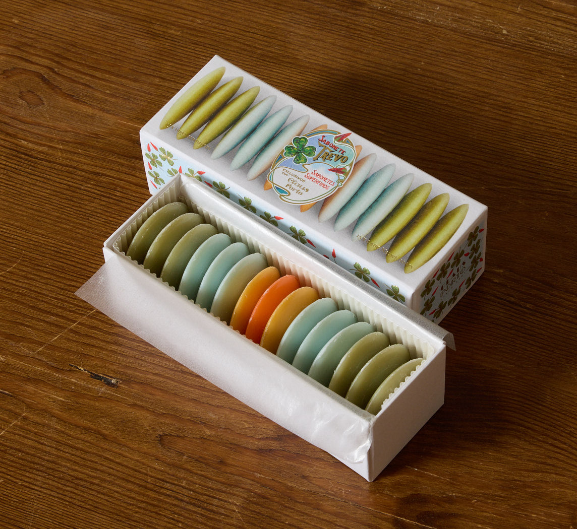 Box of fifteen guest soaps from Claus Porto’s Trevo Collection, inspired by the four-leaf clover as a symbol of luck and balance. Includes four scents, Alface, Cerina, Banho, and Favorito, each blended with shea oil for daily use or gifting.