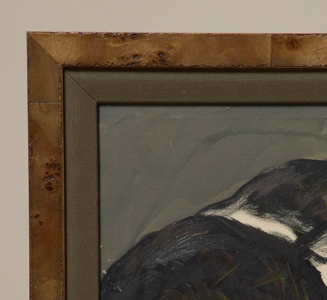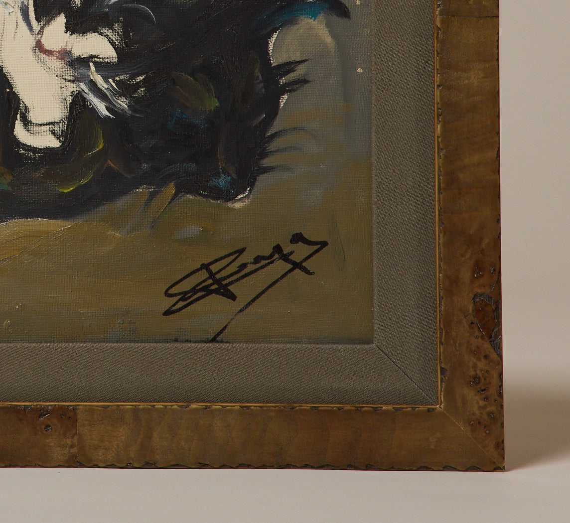 Vintage expressionist portrait of two curled cats painted in deep inky tones against a smoky gray ground. Framed in an olive Burl with olive drab mat.