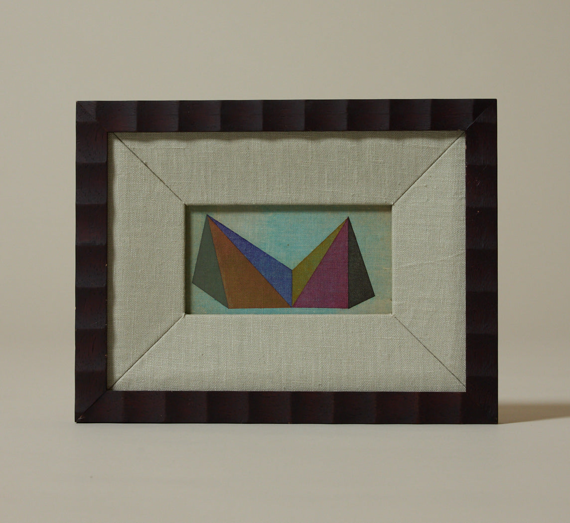 Vintage geometric abstract painting with interlocking angular forms in ochre, magenta, teal, and navy on a soft aqua ground. Framed in a carved wood mirror with breeze linen mat.