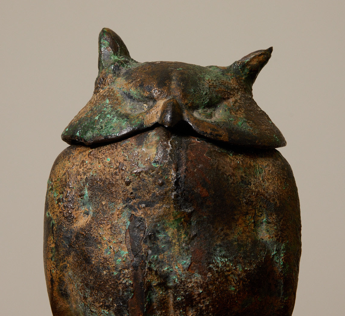 Vintage Japanese cast iron owl incense burner with removable lid and tripod feet. Textured surface with dark patina and green oxidation highlights.