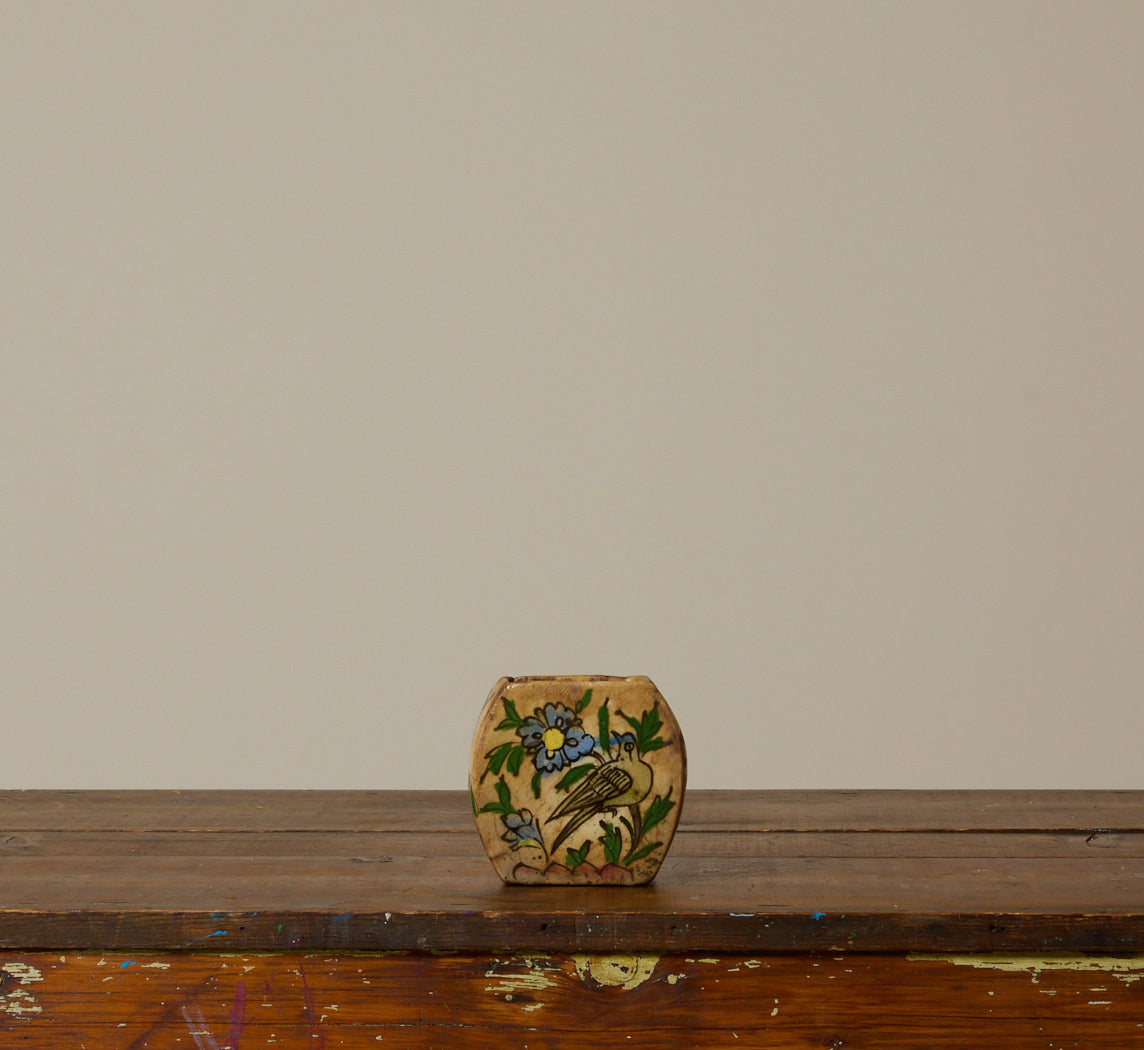 Vintage Persian Iznik ceramic vase decorated with a bird and blue floral motifs. Hand-painted with vivid glaze on a crackled cream background.