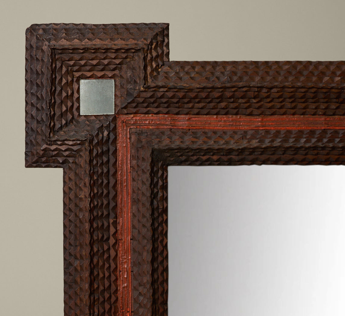 Oversized 19th century American tramp art mirror with layered geometric carvings, inset corner mirrors, and painted red detailing accenting the frame.